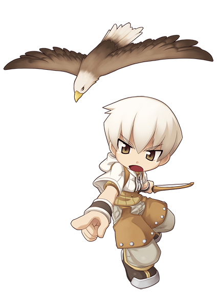 **Hunter มีความชำนาญในการต่อสู้ทางอ้อม ASPD ที่เพิ่มขึ้นของพวกเขาด้วยธนู** ช่วยให้พวกเขาเหนือกว่านักธนูในการต่อสู้ระยะไกล พวกเขายังสามารถวางทุ่นระเบิดและกับดักบนพื้นดินเพื่อขัดขวางหรือจับฝูงชน กับดักเหล่านี้จะทำให้เกิดเอฟเฟกต์สถานะต่างๆ (เช่น Sandman ทำให้สถานะหลับ) หรือสร้างความเสียหายตามองค์ประกอบ (เช่น Blast Mine, Land Mine) ต่อเป้าหมาย นอกจากนี้ พวกมันยังมีตัวละครย่อยที่ทรงพลังอย่าง Falcon Falcons มี